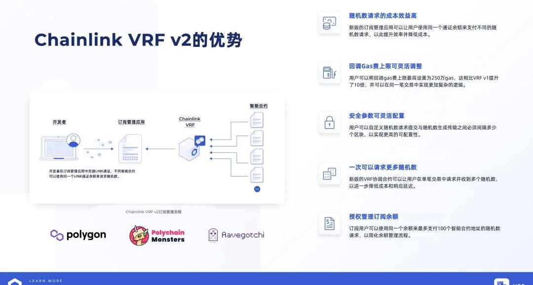 自从Chainlink可验证随机函数去年在Polygon发布以来,已经成为了智能合约随机数生成解决方案的行业标准。而ChainlinkVRF作为区块链不可或缺的开发工具,目前又发布了新的升级版本,并正式在Polygon主网上线。Polygon上的开发者可以将ChainlinkVRFv2接入自己的去中心化应用,快速生成安全的链上随机数,并同时保障成本效益。他们可以用随机数来铸造NFT,在区块链游戏中生成公平的结果,并且在DeFi和DAO治理等各个领域打造一系列创新的应用。