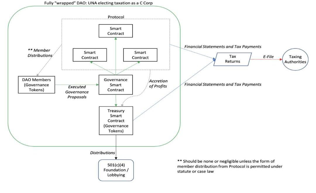 他们可以在开曼群岛或马绍尔群岛等对加密货币友好的司法管辖区注册成立。或者,他们可以走怀俄明州或田纳西州有限责任公司的路线。他们可以建立一个独立的法律实体,如瑞士协会,为他们处理合同和协议。
