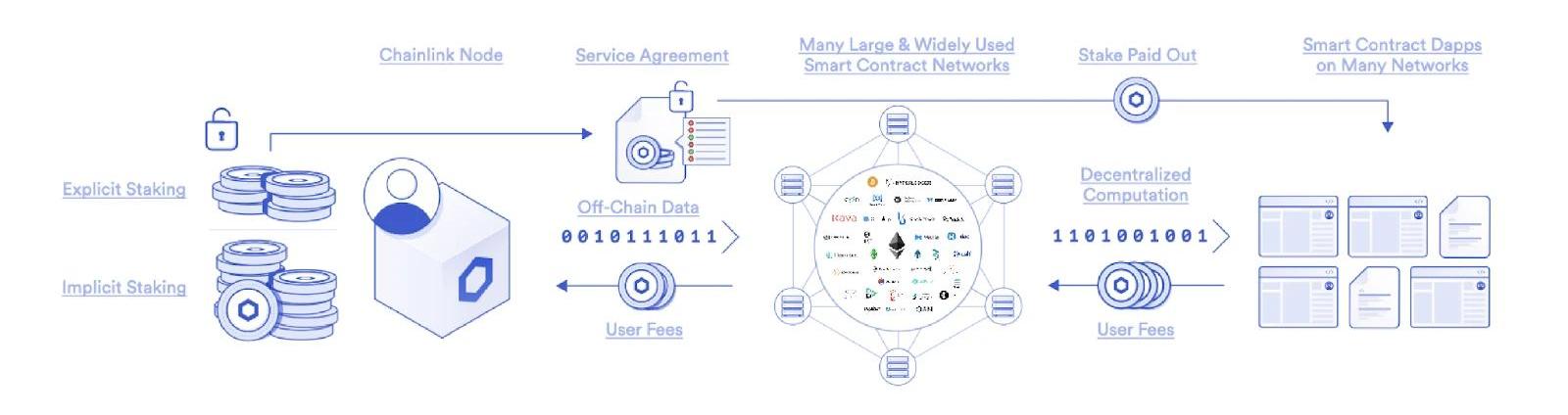 Chainlink结合了隐性质押机制和显性质押机制。隐性质押机制包含预言机节点的声誉系统和未来费用收入机会;而在显性质押机制中,节点需要根据服务水平协议智能合约中的条款质押保证金,如果违反条款,保证金会被没收。