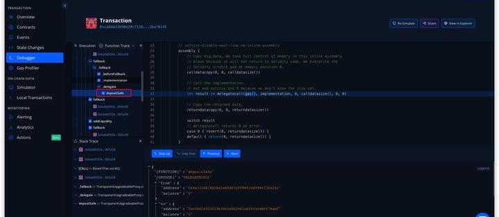 分析交易的Debugger,可以看到调用的是depositSafe函数。