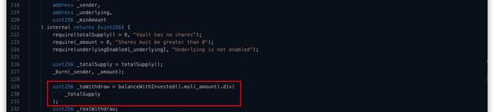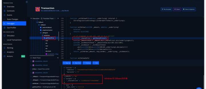 在withdraw函数中我们发现同样调用了getSharePrice计算OShare价格,在该阶段为1136563707735425848,OShare的价格的确变大了,而最终的取款数量是通过内部调用_withdraw函数计算得到的。