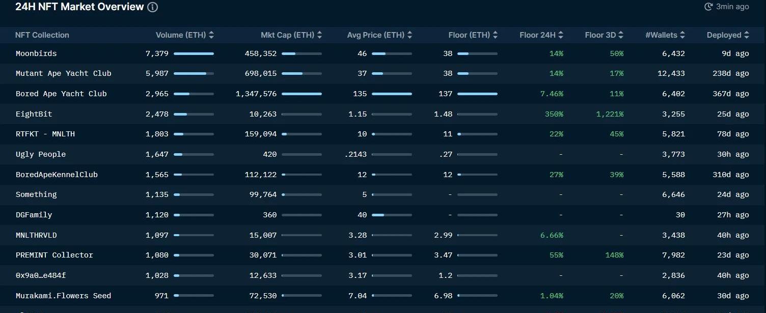 短期内Moonbirds的交易量依旧维持在极高水准,已连续三日获得交易量排行榜第一名,紧随其后的是APE的两个系列,值得注意的是EightBit,该团队在2010年推出了最初的头像创建器,2022年3月31日起开始公开发售EightBit,Mint成本为0.05ETH,曾在4月4日出现过一次疑似建仓,在4月22日起开始出现大规模交易,一路将地板价拉升至2.4ETH。