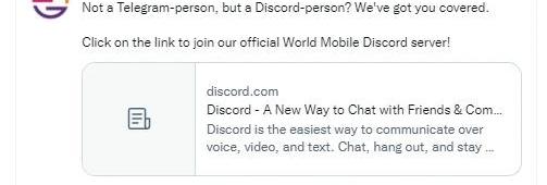 2022年3月21日为使广大用户更好地进行交流WorldMobileDiscord服务器正式上线!点击链接可进入我们的官方WorldMobileDiscord服务器!https://discord.com/invite/worldmobile