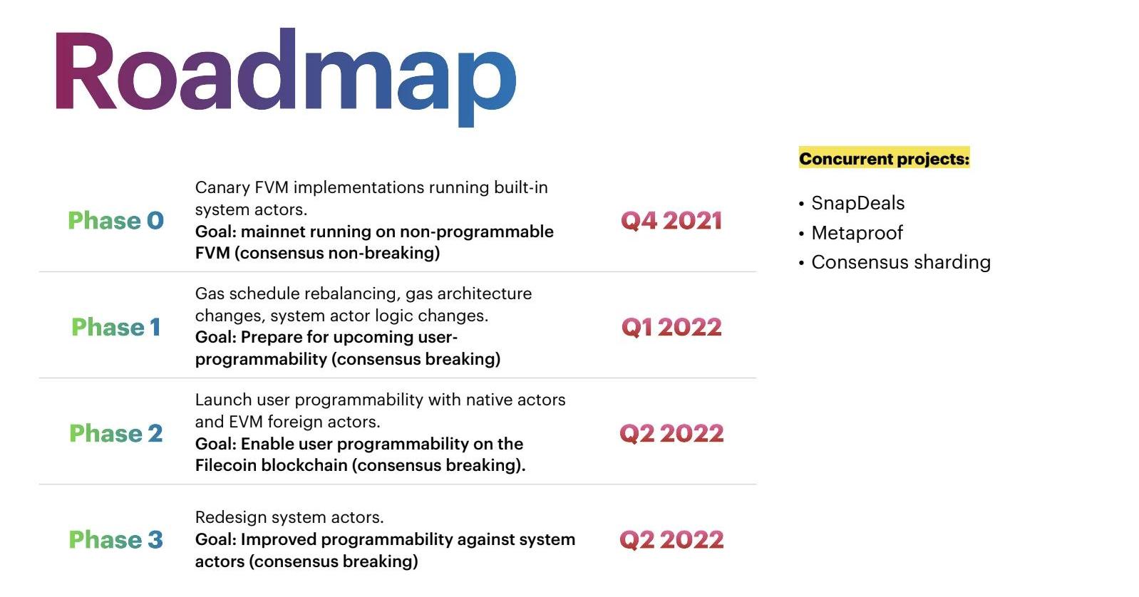 Filecoin虚拟机开发路线图的近期包括四个阶段,具体内容如下: