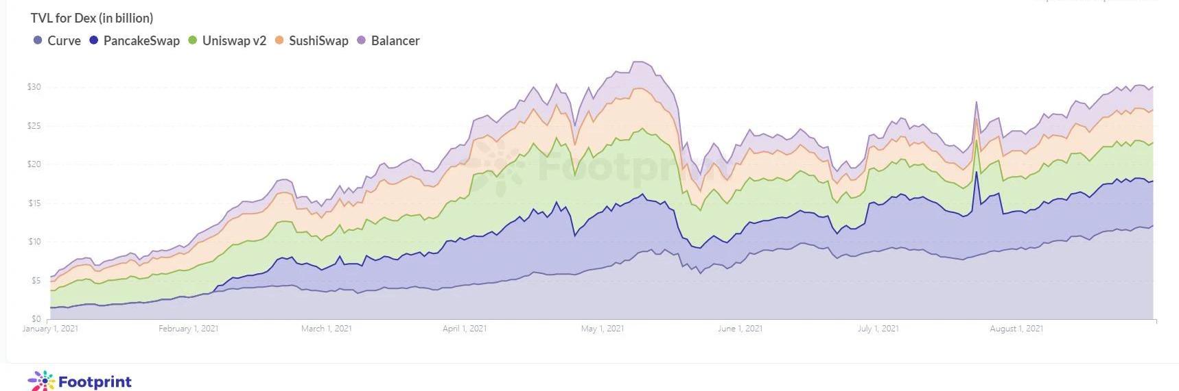 头部Dex类平台TVL占有率变化,数据来源:FootprintAnalytics