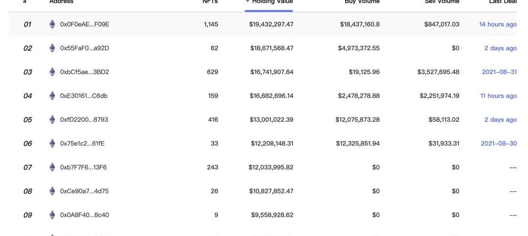 Avatar项目内也存在着巨鲸——我们称他们为「项目巨鲸」。「项目巨鲸」是指在某一NFT项目内拥有最多该项目NFT/最高该项目NFT持仓价值的地址。它们掌握着某一项目内的大量高额NFT,堪称细分领域内的专家。如果说「市场巨鲸」能够协助我们把握市场最新动态、找到市场未来热度方向,那么「项目巨鲸」则能够协助我们第一时间察觉某一具体项目的未来走势、及时做出买卖决定。
