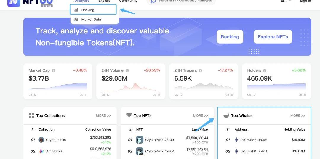 进入NFTGO首页(https://nftgo.io/),依次点击“Analytics-Ranking-Whales”找到巨鲸排行榜,或直接点击“TopWhales”进入巨鲸排行榜。
