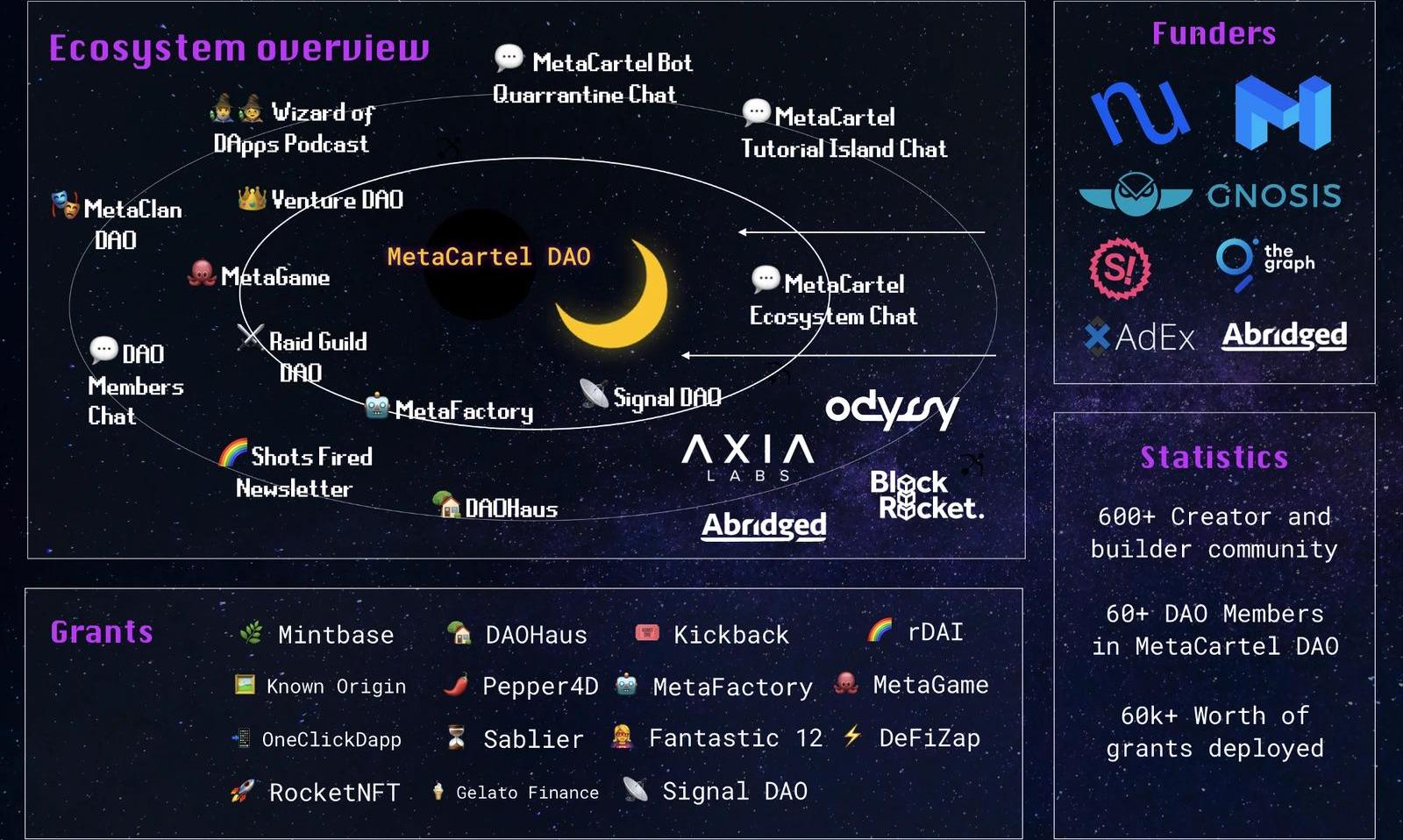 DAO将Aave、NexusMutual、OceanProtocol和AxieInfinity的首席执行官视为成员。其中一个孵化了Raible、GelatoNetwork和DAOHaus。那是Metacartel为你。DAO是在2017年之后的熊市中成立的,旨在建立一个由创始人和建设者组成的生态系统。个人进入DAO本身的成本约为10ETH,机构则为50ETH。这为DAO带来了资金,同时管理了谁购买了交易流。仅凭钱是无法进入的。个人应该向DAO推销自己,并获得足够的支持才能成为成员。DAO本身很乐意成为早期组织的第一个检查员。加入DOA是一个许可的过程,需要成员的共识,但退出是未经许可的。离开Metacartel的个人按比例获得DAO持有的资产份额。成为风险基金只是Metacartel所做的众多事情之一。