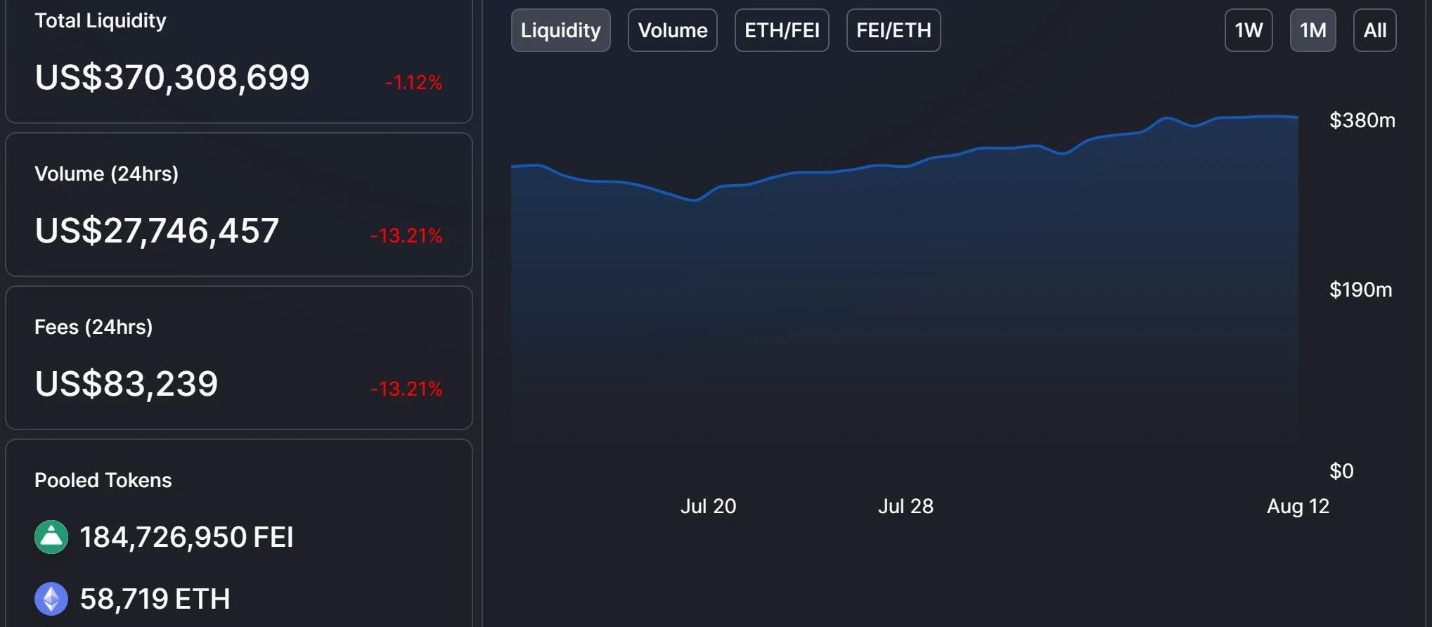 在Uniswap的ETH/FEI锁定了价值3.7亿美元,24小时成交量2774万美元,创造了83239美元的手续费收入。