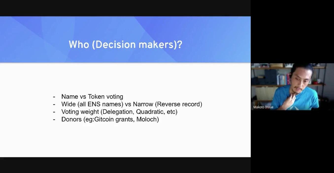 ENS目前还没有实现DAO的治理。注册费资金钱包由4/7多签名控制,持钥人包括Nick、Sergey(Chainlink创始人)、DanFinlay(Metamask核心开发)等。ENS的去中心化治理面临长期愿景和短期利益的冲突问题,如果简单根据域名数持有量分配决策权,囤积居奇的投机者很容易操纵治理过程,发起例如降低年费租金等提案来降低抢注成本,使得域名无法落入真正使用的项目方手中,不利于ENS本身的大规模应用。因此在3月举行的线上workshop中,社区讨论了使用GrantDAO形式决定金库收入的撒钱姿势,试验ENS的治理道路。ENS官方也在7月放出了治理主管的招募,DAO治理的推进正在加速。