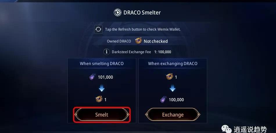 如果是主线任务打不死BOSS,就以猥琐为主,等技能全了去给他一套,然后赶快跑,技能不全的时候以躲伤害为主,在刷怪做任务之前一定要准备好足够的红蓝药,到药水商人那里购买就可以。实在过不了主线任务的就自己去刷支线任务,把等级和战斗力都提上来再说,中间也有所谓的挖矿套装,大家也可以多看看攻略。本人对游戏也不是太精通,想知道更好的打怪和升级方式的小伙伴可以到GameFi群里交流,当然自己多多体验是最重要的。提现方式由于本人还没有到40级,还没有体验过提现,所以这里搬运其他玩家的提现方式,大家可以参考一下。冶炼黑铁使用账户持有的黑铁就可以冶炼成DRACO。而额外使用的黑铁交换费,将会根据全服累积的黑铁采集量在每天都进行更新。点击冶炼按键,当日的黑铁交换费加上手续费使用的1,000黑铁合计后的费用,即可申请冶炼1个DRACO。