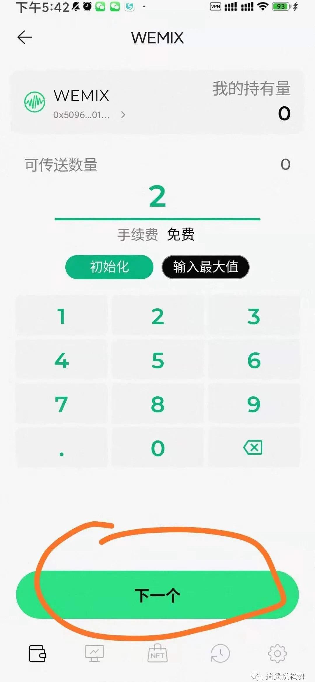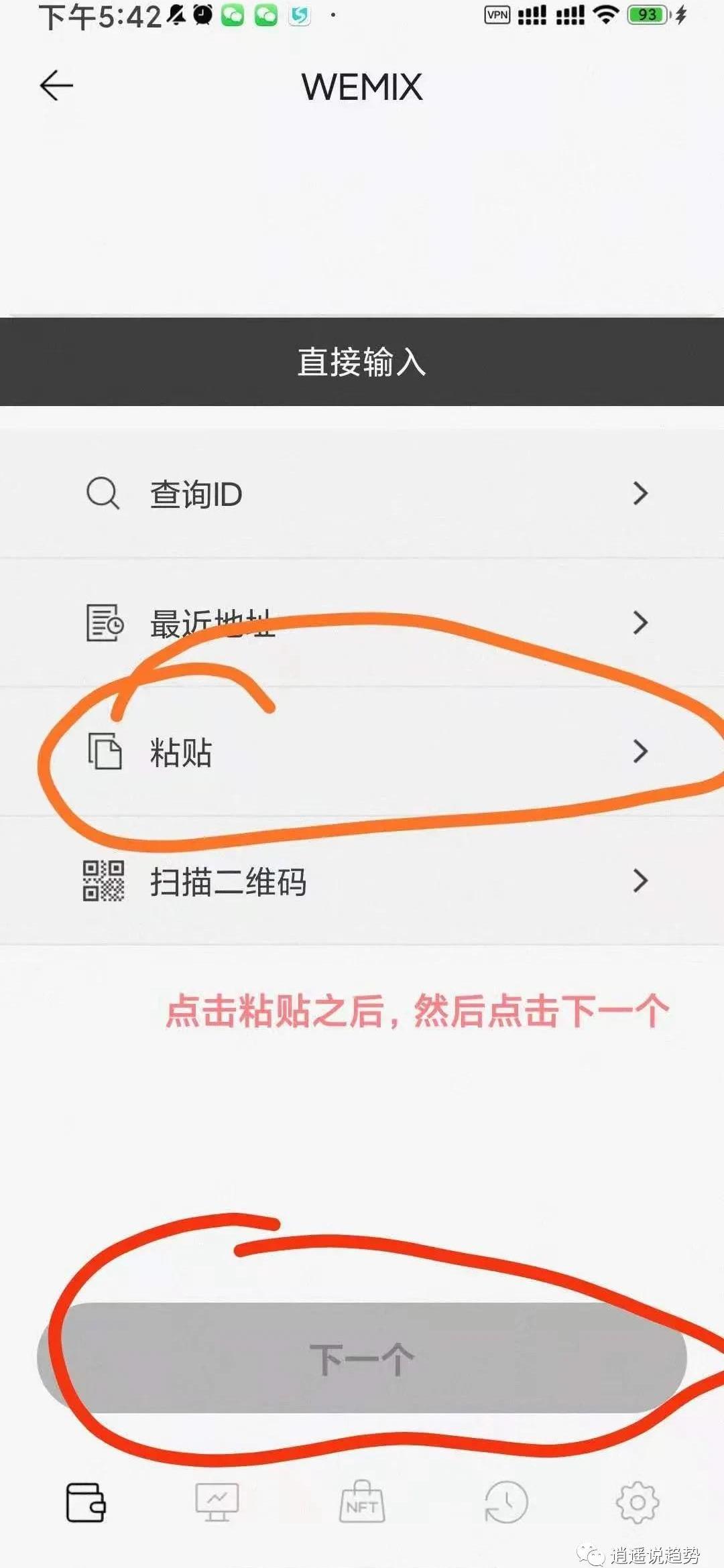5.然后从下文注册提现wemix收款地址的方法中复制地址,然后点击粘贴,点击下一个,输入传送的数量