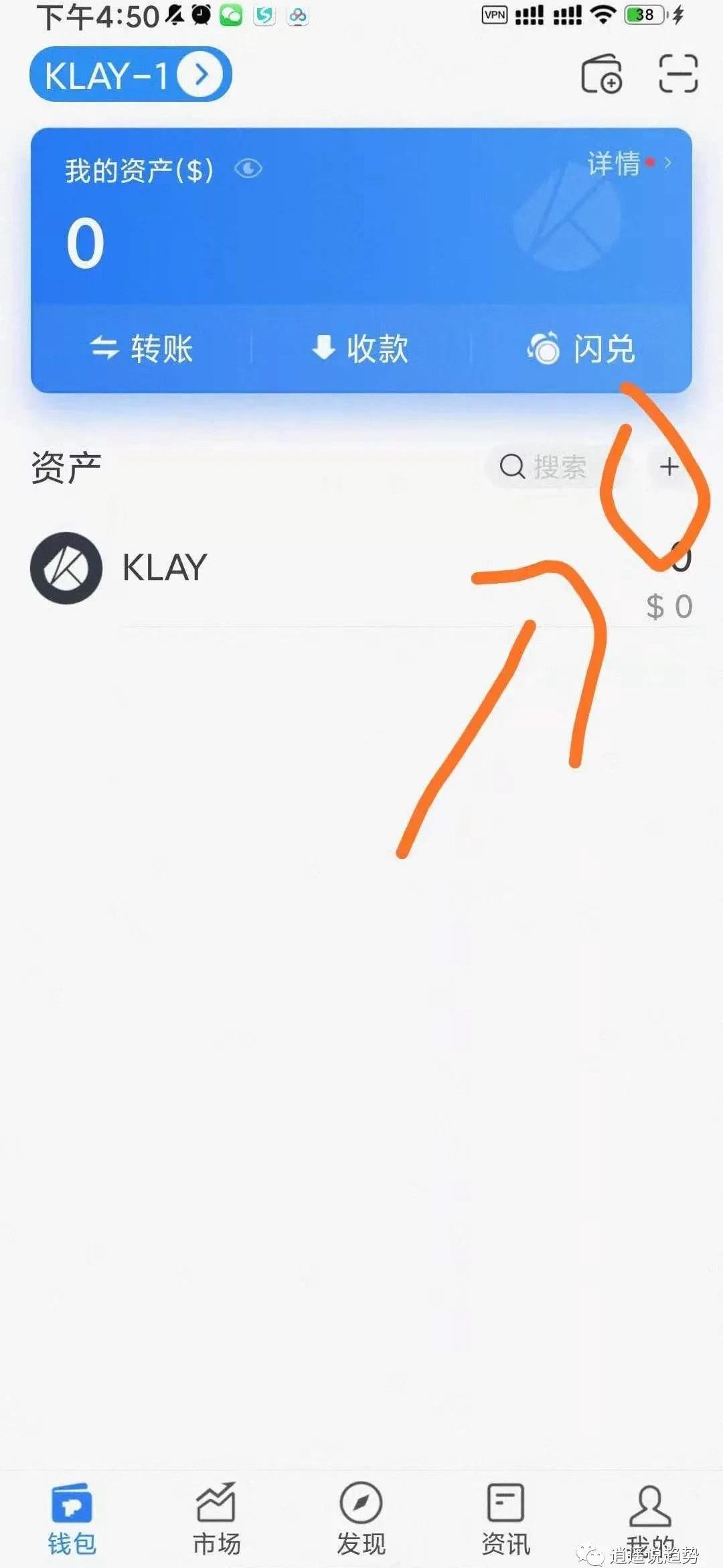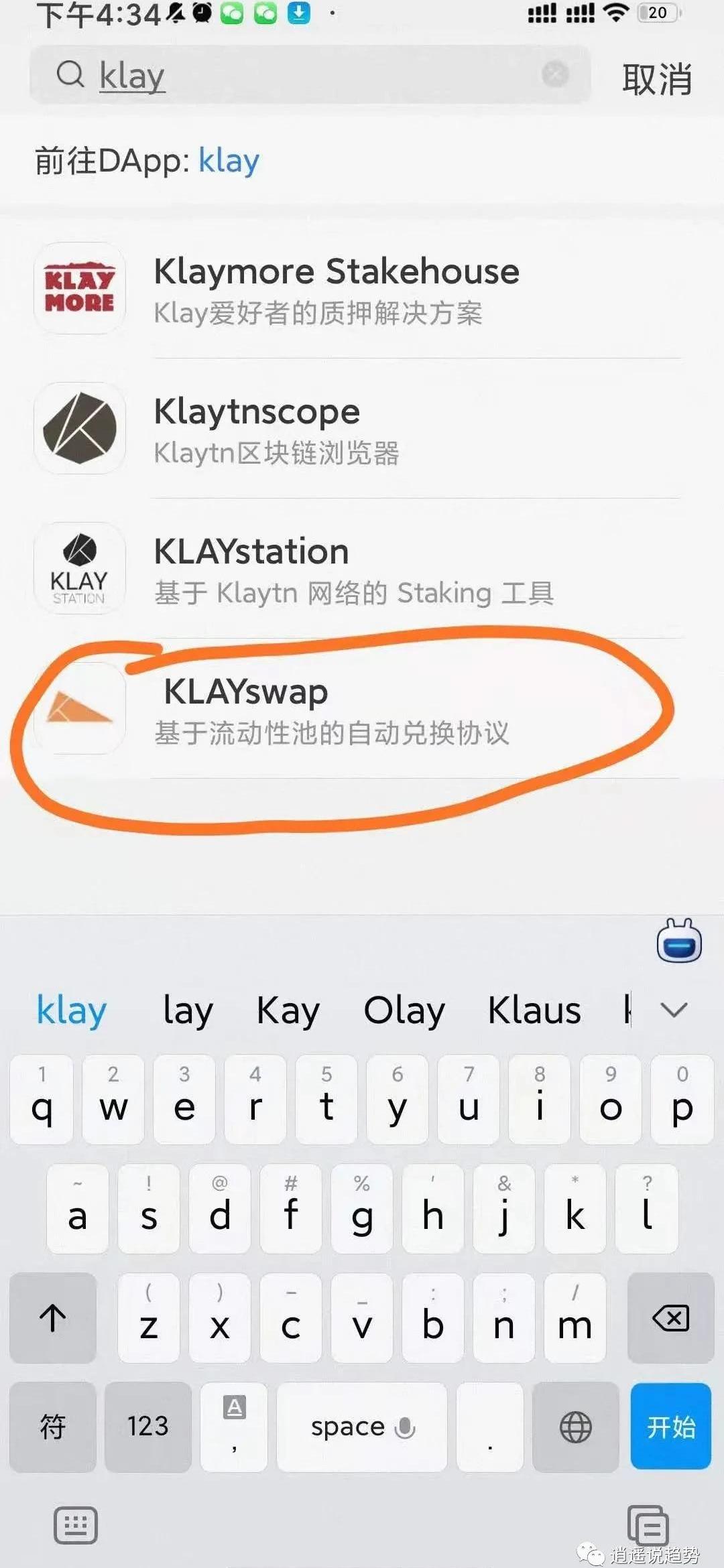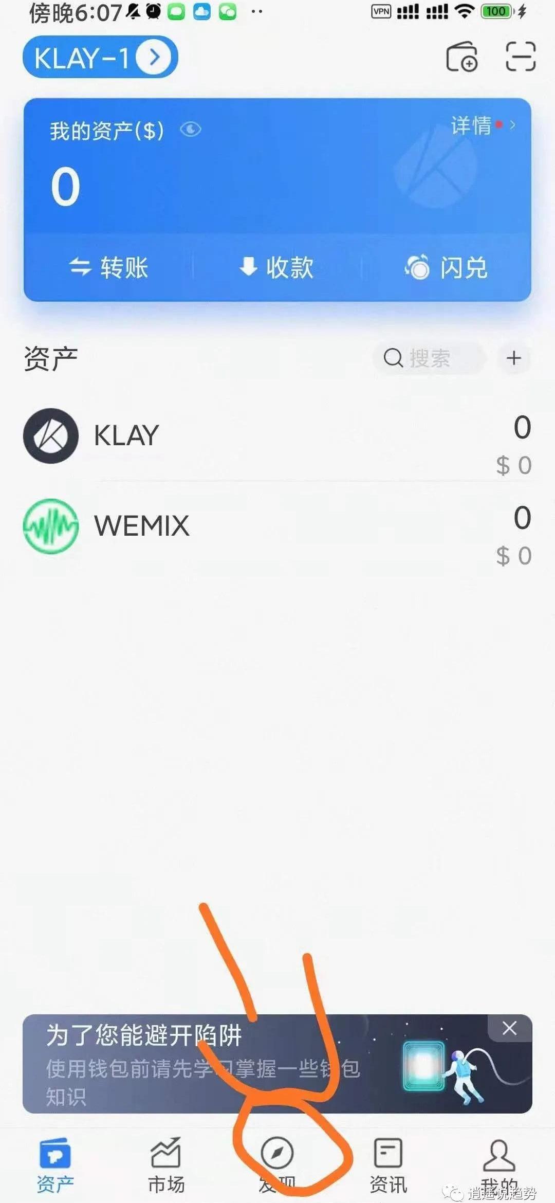5.在TP钱包收到wemix后,点击TP钱包里面的发现,然后搜索框输入KLAYswap。