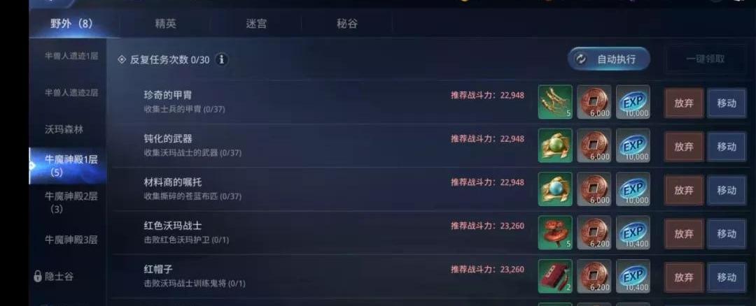 玩法方面,升级主要还是以主线任务为主,即左边这个蓝色字体的任务,只要点击这块部分,任务就会自动去完成任务,完成后继续点击就可以完成下一个任务了。