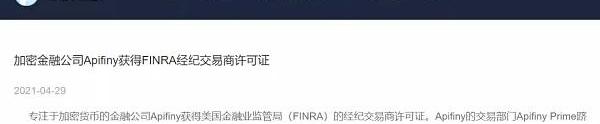 值得注意的一点是,Apifiny在今年4月,Coinbase上市当月,也获得了美国金融业监管局的经纪交易商许可证。媒体报道称,其已跻身Coinbase、Gemini、eToro和Circle等合规交易所行列,至于能否激起Coinbase上市时的浪花,有待观察。