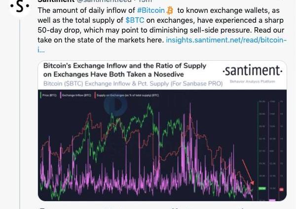 而BTC上近期的情况也开始停止了恶化,Santiment数据显示,BTC每日流入已知交易所钱包的数量以及交易所的BTC总供应量,近50天都经历了急剧下降,这可能表明卖方压力正在减弱。