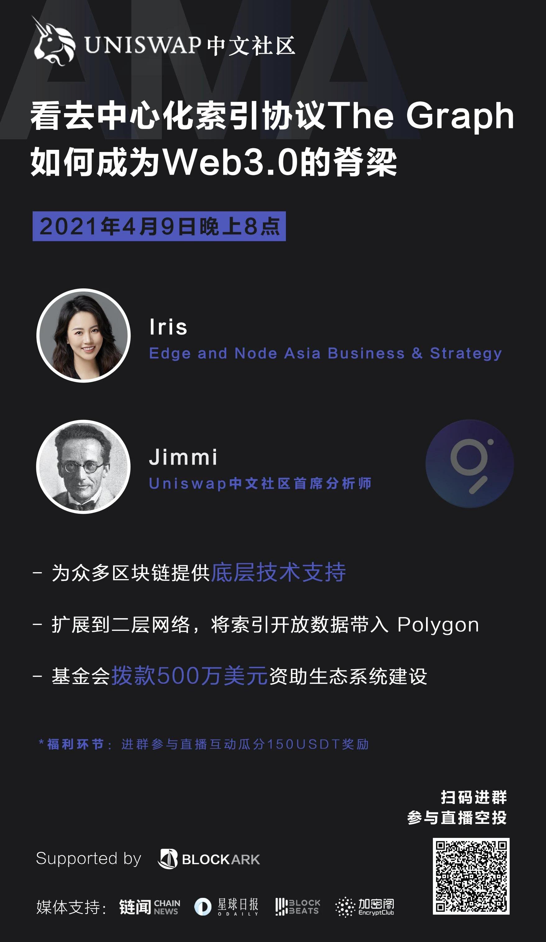 2021年4月9日晚上8点,EdgeandNodeAsiaBusiness&StrategyIris将做客Uniswap中文社区,由Uniswap中文社区首席分析师Jimm主持,带来“看去中心化索引协议TheGraph如何成为Web3.0的脊梁”的主题AMA活动,本次直播活动由区块方舟BlockArk支持,链闻ChainNews、星球日报Odaily、区块律动BlockBeats、加密阁媒体支持,直播分享内容整理如下: