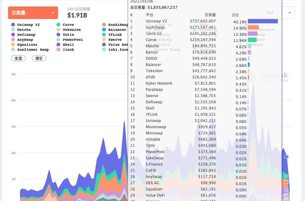 目前以太坊上DEX的24小时交易量维持在20亿美金左右,最高峰时曾达到45亿美金,这个体量已经和一些大的中心化交易所很接近了,因此DEX也成为了中心化交易所极其关注的一条赛道。
