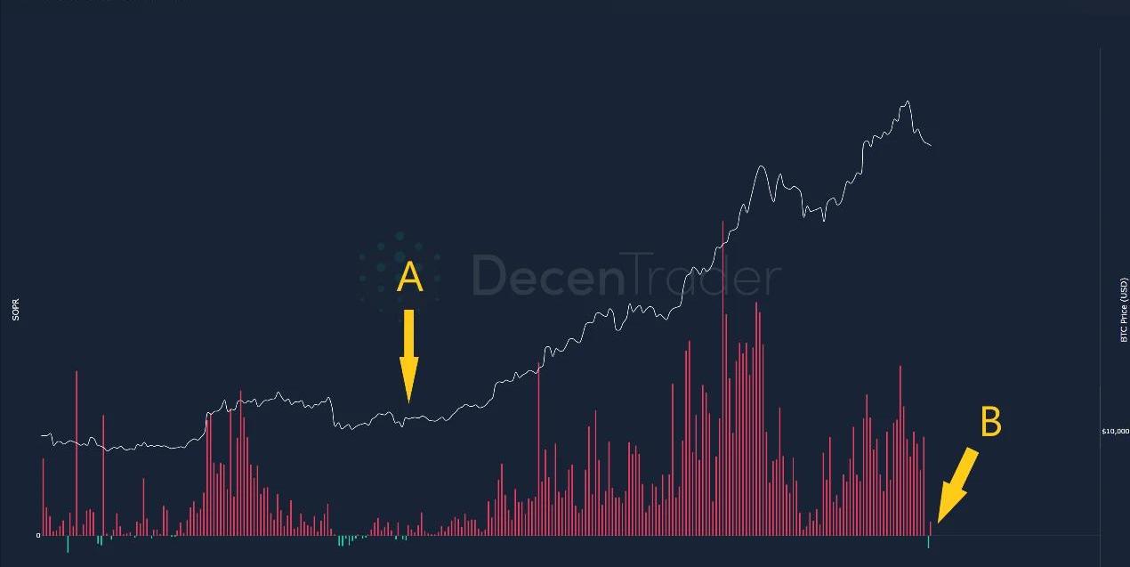 SOPR指标通过链上数据观察投资人目前销售比特币会产生收益或是蒙受损失。在过去的牛市当中,当该指标指向投资人正在亏钱出售比特币时,通常意味着买入的绝佳时机。上图为2017年牛市的SOPR指标,我们可以看到每次出现绿色区域时,比特币价格都出现了牛市中的回调底部。