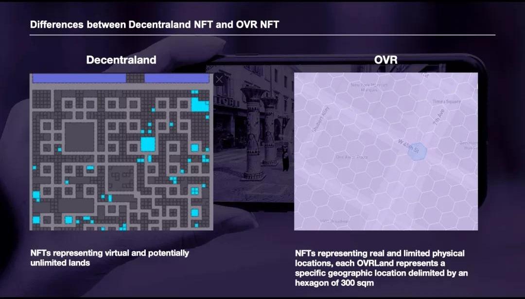 你可能已经听说过Decentraland的成功案例。Decentraland也是将土地作为NFTs概念的项目,OVR土地本身也是NFT。但我们有本质的区别在于:decentraland是一个完整的虚拟世界,而每一块OVR土地都代表着一个真实的地理位置。每一块OVR土地代表着这个真实世界里300平方米的一片区域。