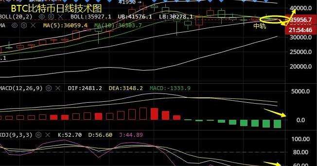 比特币,日线上看小幅收阴,整体走势越来越窄,BOLL呈缩口状态,两大均线粘合至BOLL中轨一带,行情由之前的偏多趋势转向中性。短周期KDJ技术指标缓和向下,附图MACD下行动能放量,预计大饼将继续维持调整。四小时上看比特币多次冲高回落,整体的行情依然是处于调整之中。BOLL呈持平状态,币价运行在BOLL中轨偏下方,均线MA5/MA10粘合欲交死叉于36700美元一带压制其上行,而下方则重点关注BOLL下轨于34800美元一带支撑情况。短周期KDJ技术指标缓和向下,附图MACD动能缩量,预计大饼将继续维持调整。