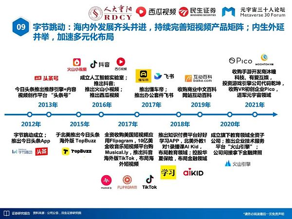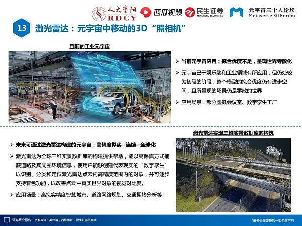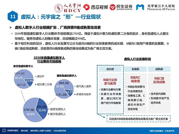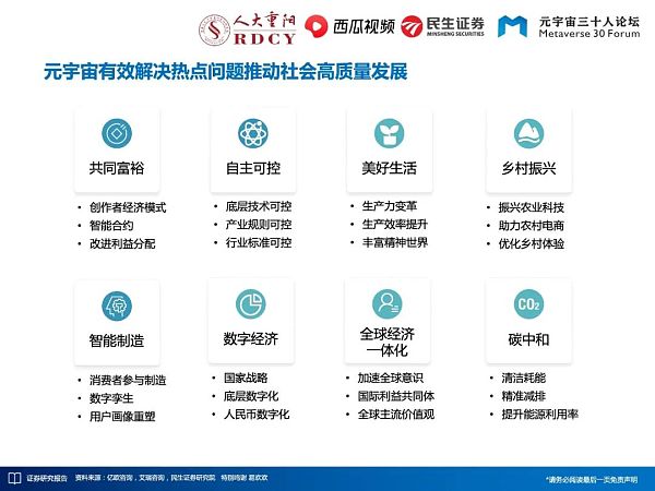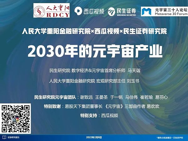 2021年元宇宙横空出世,成为资本市场的兴奋剂、学术界的热议焦点。然而元宇宙究竟如何改变我们的生活方式,又能带来哪些新的机遇?这些问题众说纷纭,我们仿佛看到了一个伟大的时代即将到来,但依旧是“雾里看花”,仅能隐隐得看到一个“轮廓”。但我们坚信,未来不是预测的,而是创造的。通过深度数据梳理与反复逻辑推演,民生研究院联合人大重阳金融研究院、抖音西瓜视频,元宇宙30人论坛联合发布了虎年第一篇230页《2030年的元宇宙产业》深度报告,希望同各位一起,迎接下一个“沸腾新十年”。