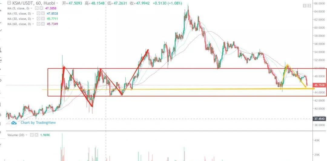 KSM再次跟随市场下跌,下跌无量,随趋势而动,44再次成为探底点。由于再次测试低点,是否可以守住,全看其他主流币的风向,暂不做进出的策略,继续观望为主。