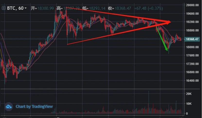 BTC第一次大幅杀跌并反弹至最高的18950后,逐步的行情开始形成一个收敛的三角震荡区间,如图中两条红色箭头,在前日BTC跌破三角收敛下方支撑线后,破位向下,方向确认,短期将面临大幅调整。