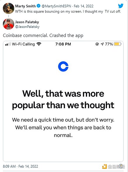 Coinbase的商业广告无疑及其成功。超级碗广告播出不久,人们在推特上表示Coinbase的网站和应用程序已经宕机崩溃。