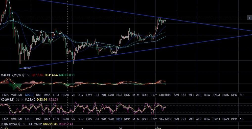 以太坊在前天触及到了420的位置后,目前也是处于高位震荡的环节,但是后期ETH2.0利好强烈,后面依旧会开启持续上涨行情。从4小时图来看,MACD在形成死叉后一直在不断的向0轴方向靠近,绿色动能也在不断增量,前期高点的位置不断的下移。虽然以太坊大周期是看涨,但是今天薪火teacher-yym看好以太走一个回调修复的走势。上方420的压制,下方405的支撑位置,区间内高沽低渣。