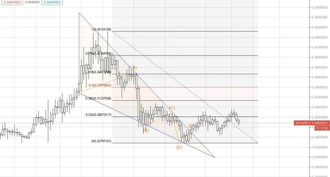 同样的情况也发生在IOTA身上。突破下降楔形,但是拒绝0.236斐波那契水平。