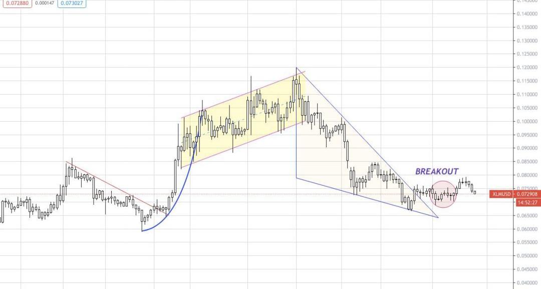 这个下降楔形在下方平行通道被突破后形成。在下降楔形之前,XLM自3月以来出现了巨大的上升运动。然而,从下降楔形的峰值到谷底,XLM损失了40%的价值。这使得XLM从0.12美元跌至0.65美元左右。