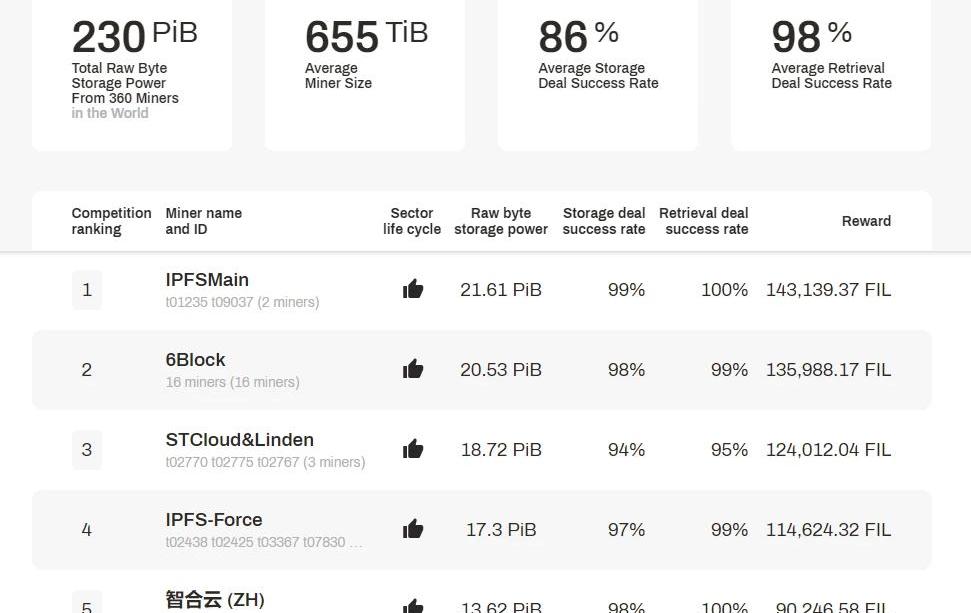 9月15日06:00,首届Filecoin太空竞赛圆满结束,全网有效算力为230PiB,为初始目标的2.3倍。存储平均成功率86%,检索平均成功率98%。