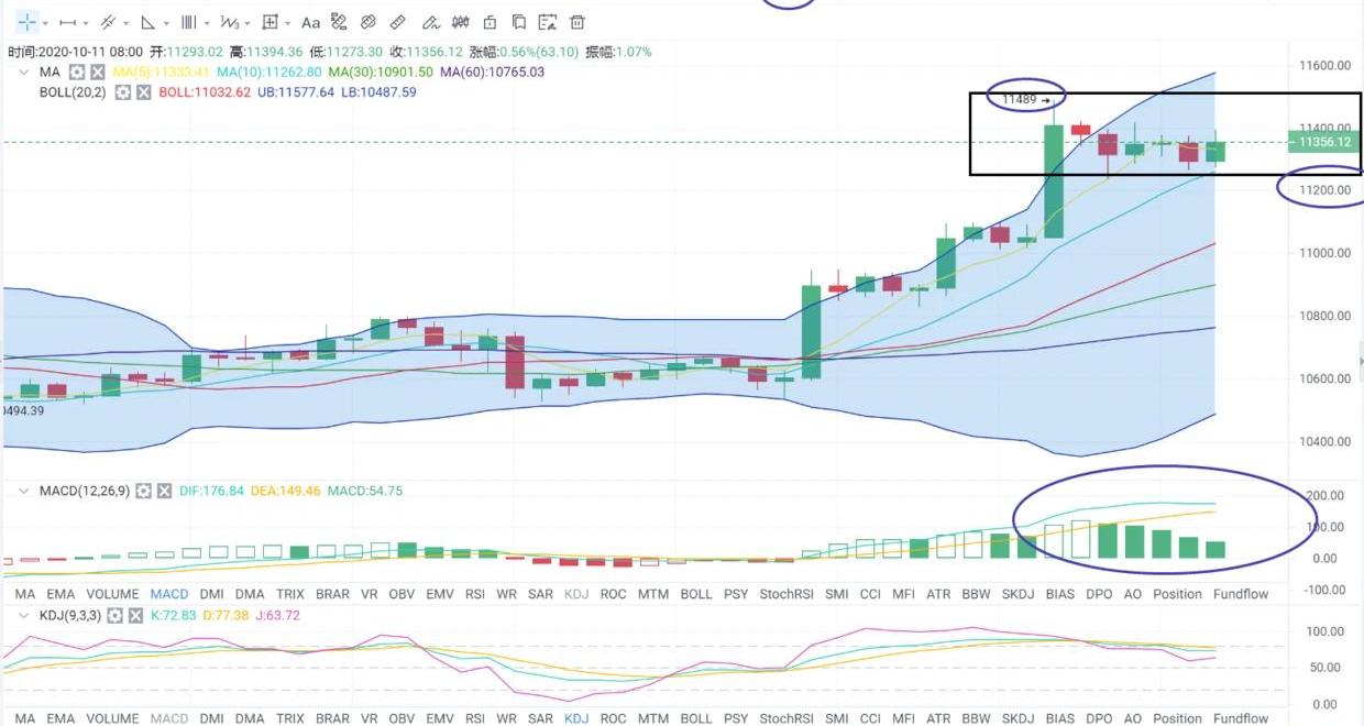 日内凌晨比特币行情延续盘整,多头上攻力度略显疲乏,早间7点时开盘价格出现小幅回落,最低触及11268附近。日线图上看,K线强势三连阳,当前价格仍保持在布林带上方区域,上方阻力关注11500位置,多空双方焦灼,行情维持高位震荡,日内若是不能打破上方压制,震荡行情还会延续,重点关注11200-11500区间内。