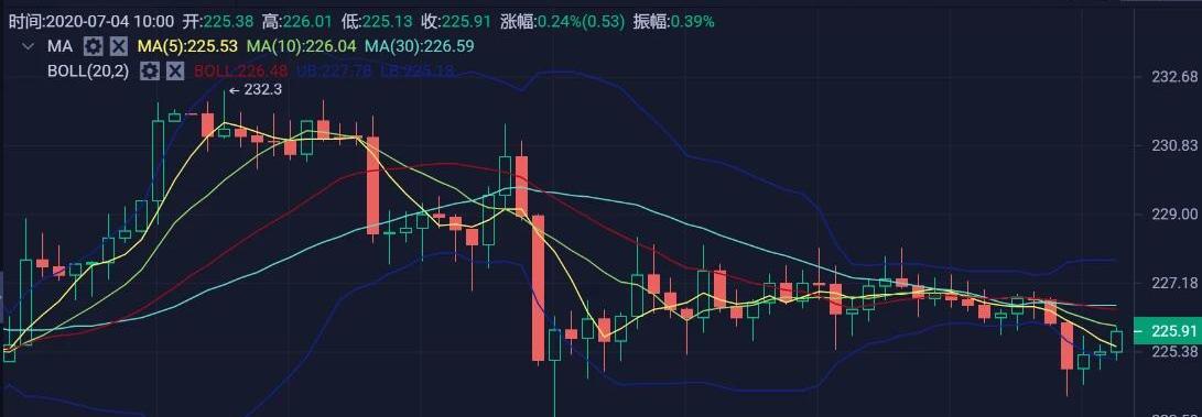 从小时图来看,币价从布林中下轨区域跌破下轨支撑,最低来到224.2一线,布林轨道随着币价的下行开口扩张,币价在触底获得支撑后有所反弹,目前运行在布林下轨下方225一线附近波动,处在各均线下方,MA5与MA10均线拐头下行,在币价上方形成短期的一线压制,MA20.MA30均线粘合在226一线附近在币价上方形成第二压制,附图指标中,MACD快慢线在零轴下方开口平行,多头能量有所放量,RSI拐头上扬,KDJ三线聚合有形成金叉向上发散的迹象,目前来看,趋势处于震荡调整状态,日内操作上七月建议高空低多为主。