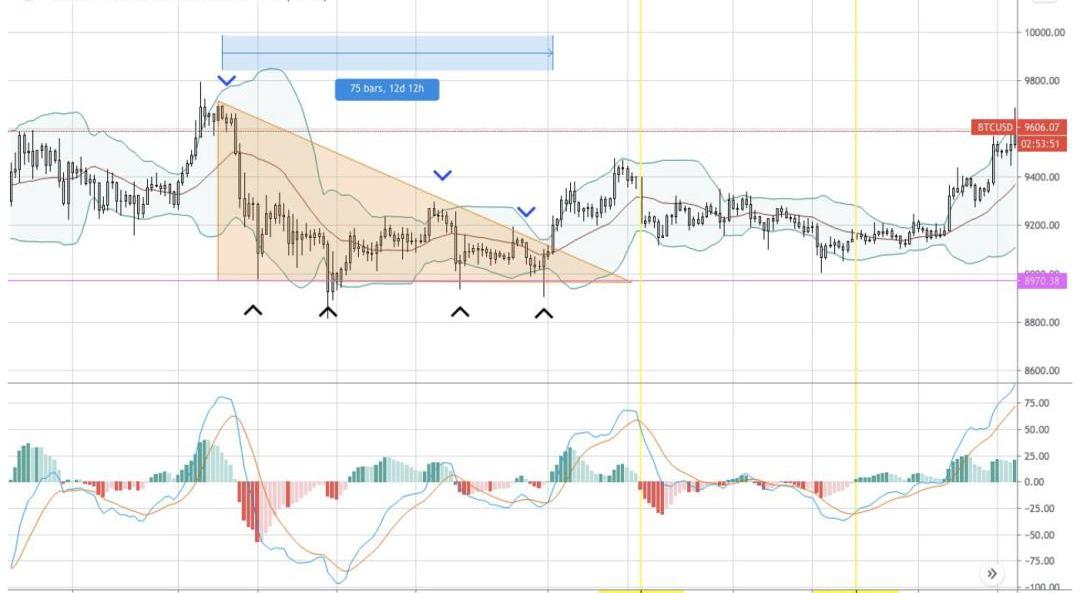 BTC未能大幅突破0.618斐波那契水平,BTC价格从9500美元左右跌至近9000美元,也就是突破前的价格。在此之后,BTC价格横盘,正如BB(布林线)和BBW(布林线宽度)所示。