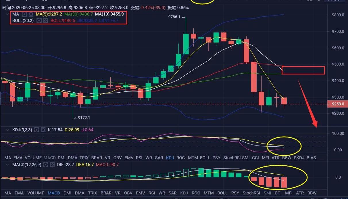 再从4小时图来看一下,BTC行情从哪里涨起来的就回到哪里,从图中可以看出已经走出了一个倒V形态;BOLL中轨由上行走平,BOLL通道依然处于张口中;MA5和MA10均线已经勾头向下,BOLL中轨和MA30均线走平与白色MA10均线交汇于9460附近;下方KDJ指标死叉向下已经走平,随着目前盘整期的度过可能会继续形成金叉迹象,能量指标MACD快慢线死叉向下,空头能量充分释放中,没有缩减的趋势,综合来分析,易天(aphz8705)认为BTC日间盘整在9250一线会先随着KDJ指标来波上攻!