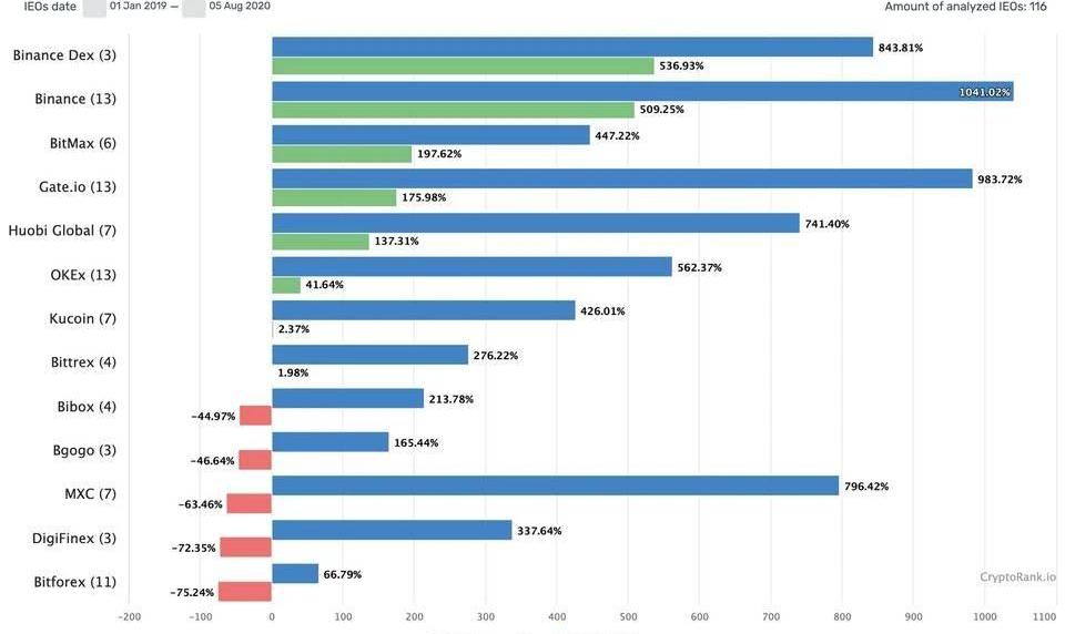 根据CRYPTO.RANK的数据,截止今日,所有项目的平均投资回报率排名中,币安中心化交易所的13个Launchpad项目以509.2%的巨大优势排名第二,币安Dex排名第一。