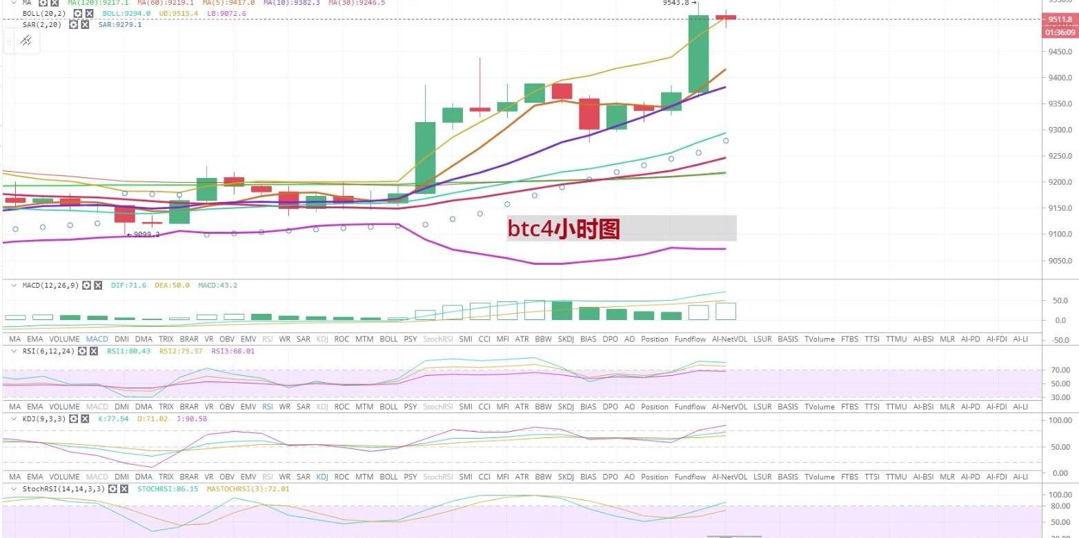 从附图4小时可以看到,布林带开口,各短期均线呈上扬姿态,目前多空双方在4小时上轨(9516)一线激烈争夺,RSI和KDJ指标处于在超买区域。整体上看,持币者认为要看上方9600关口的压制,下方要看9500是否企稳,也需要警惕之前的主力强力托盘,谨防空军的突袭。