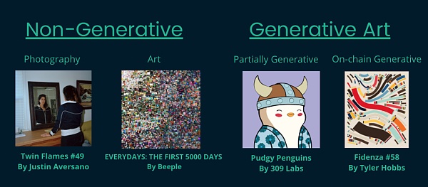 上图:左边是“非生成艺术 NFT”,右边是“生成艺术 NFT”,分别由 Justin Aversano、Beeple、309 Labs 和 Tyler Hobbs 创作。