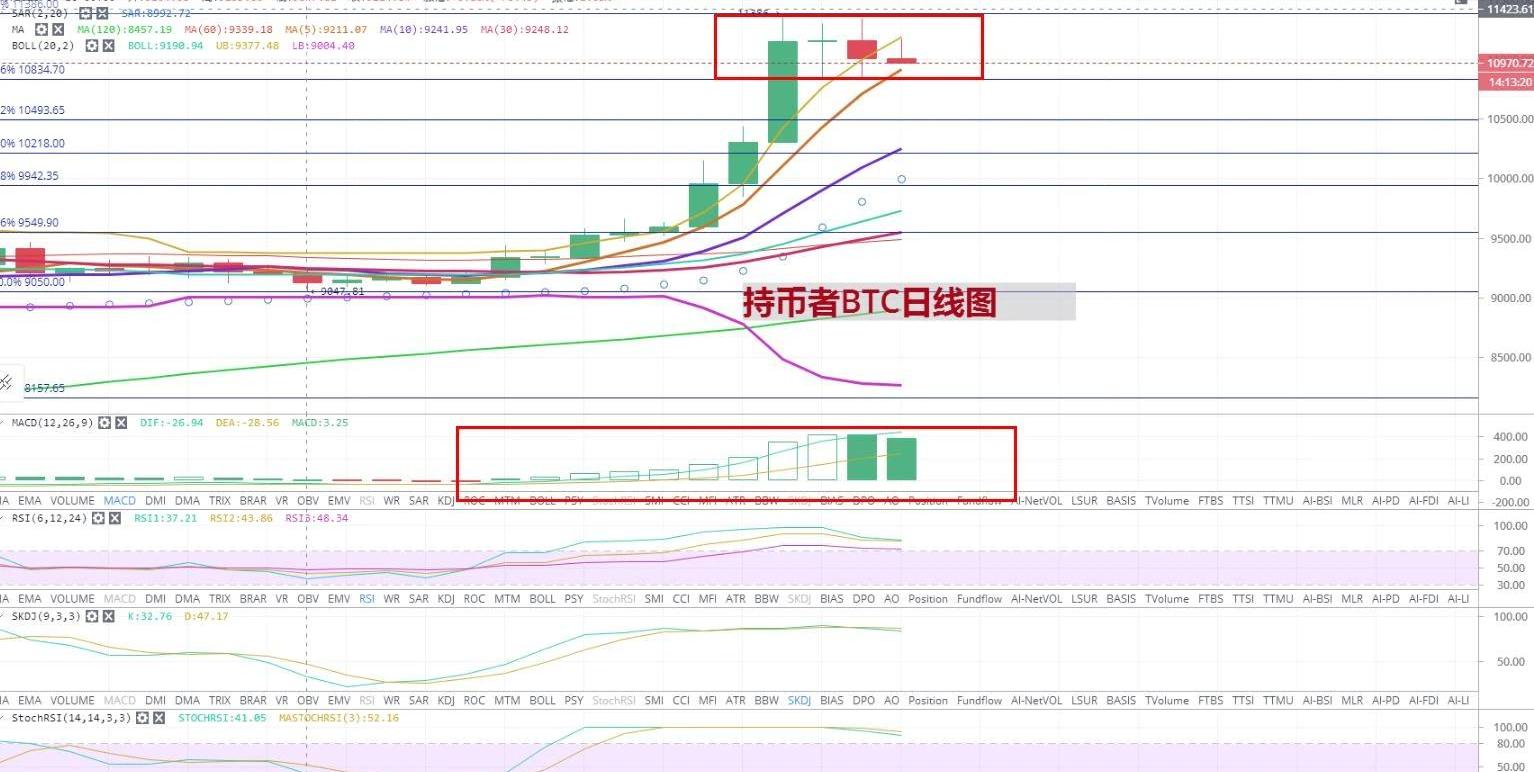 持币者最近eos很是强势,有点以太豪横的味道,可以说是领涨版块轮动,进一步激发币圈币友的激情。在持币者日线图上,比特币10天的连续收阳已被打破,目前币价已经回到布林带之内,上行力度不强,受阻于上轨(11199.7)一线,若能打破,币价还有上行的机会。