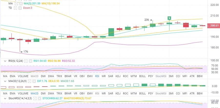ETH:以太跟随BTC步伐上涨最高来到了206附近,一小时线图回归布林中轨,上下轨开始收窄,RDJ呈现上行状态,下方MACD红柱开始缩量然后等待布林带收窄开始下一波行情;而四小时线图布林带已经有收窄的倾向,绿柱开始缩量,后续走势有向布林中轨靠近的倾向。从上涨的走势中,201是为上涨中的一个高点,那么201-202同样可以定为下跌中的一个短期高点,而下方支撑在195。因此操作方面建议高空为主,看向下方195。
