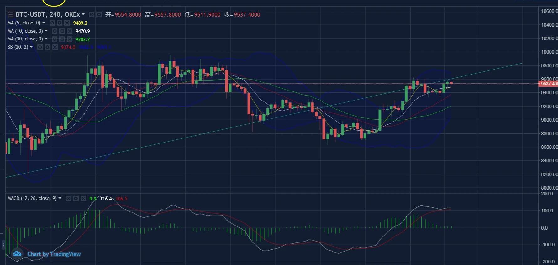 从日线上来看,虽然现在各均线系统和BOLL中轨都处于行情下方,上方貌似没有阻力了,但是为何随着这么多次的多头能量爆发,行情迟迟没有上涨呢?易天老师之前文章讲出的上行通道的下方支撑线,随着之前有效突破之后,就没有在易天的文章中出现了,但是今天易天又要旧事重提,但是含义却不一样了,之前我们是讲支撑线,现在我们说的阻力线,随着之前的支撑线的延伸,现在却变为阻力线了,随着此线的延伸,目前已经到达9600关键价位;结合各个指标来看,多头趋势非常明显,虽然上方压力足够有效,易天认为突破此位是迟早的问题;虽然现在以太坊已经领先大饼再次飞扬,但是易天认为大饼的翻身之仗已经开始,重新领导以太不成问题!