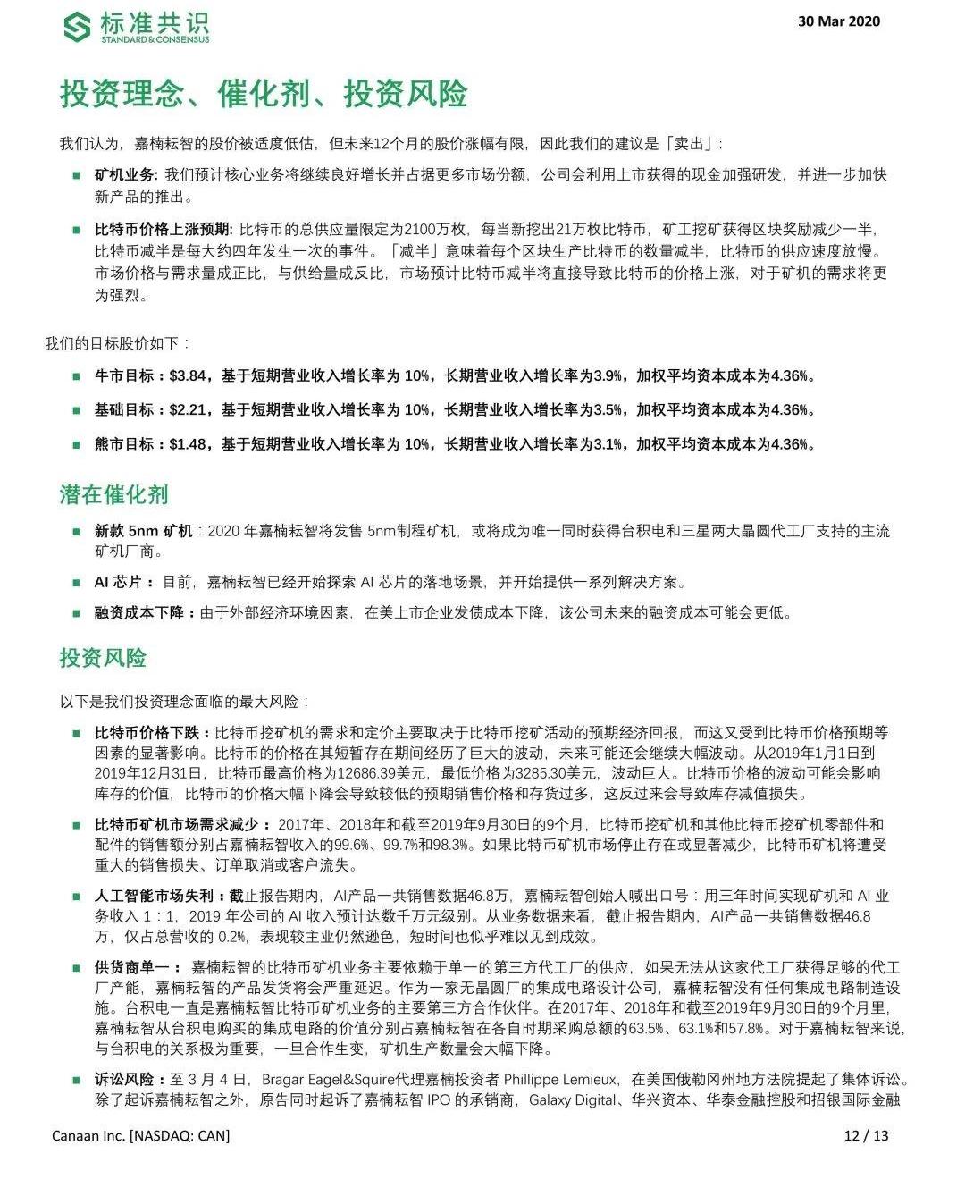 经过对基本情况进行分析,我们得出,假设在25%percentile的P/E和P/TBV对股价进行折算,我们预估嘉楠耘智内在价值为$2.315。