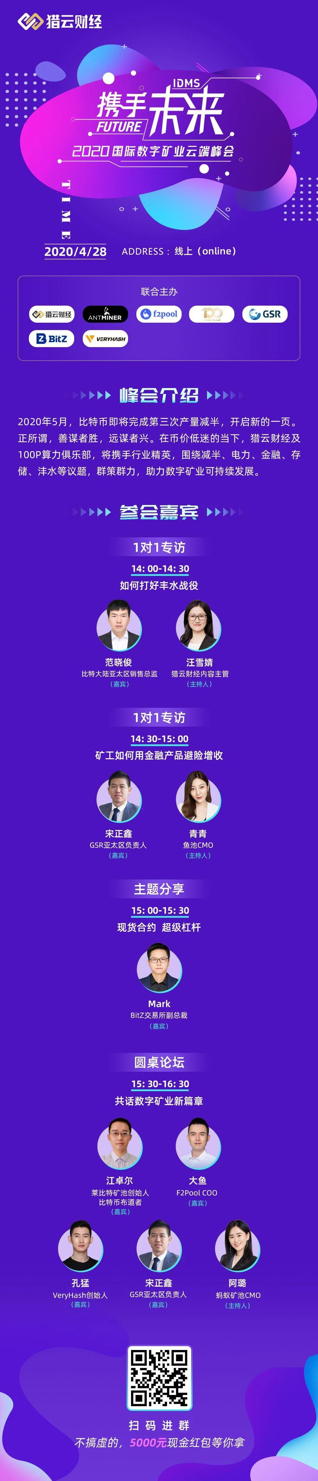 4月28日,猎云财经、蚂蚁矿机、鱼池、100P算力俱乐部、BitZ、GSR、VeryHash将联合主办一场以“携手未来”为主题的云端峰会!本次峰会不仅有顶尖级意见领袖、权威人士,更有殿堂级技术大咖、专家学者,区块链行业精英汇聚一堂,一场跨时代的思想盛宴即将拉开序幕。