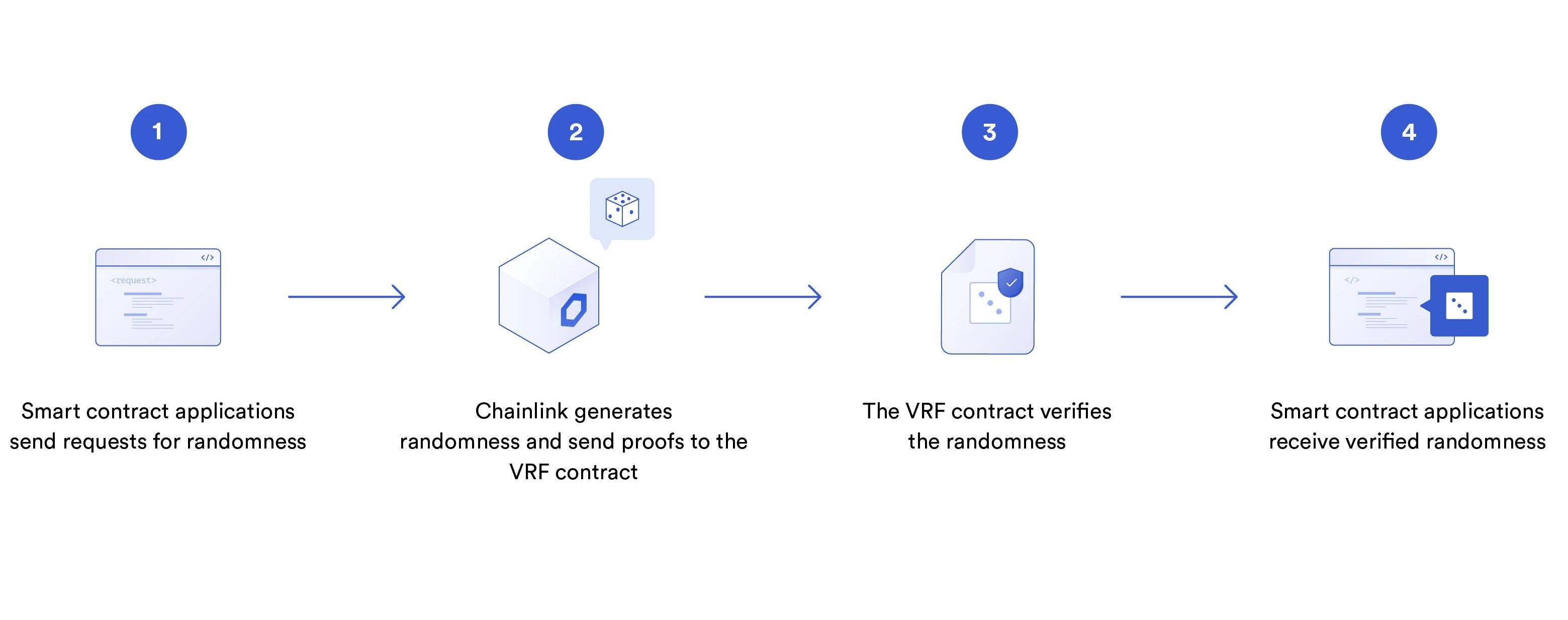 简而言之,智能合约会向Chainlink或Chainlink预言机网络提供一个seed来请求随机数。这个seed是预言机无法预测的,会被用来生成一个随机数。每个预言机都会使用自己专属的密钥生成随机数。当结果和证明在链上发布后,可以使用预言机的公钥和智能合约的seed进行验证。这个方法利用了区块链著名的签名验证功能,合约只能使用在同一区块链环境中被验证通过的随机数。