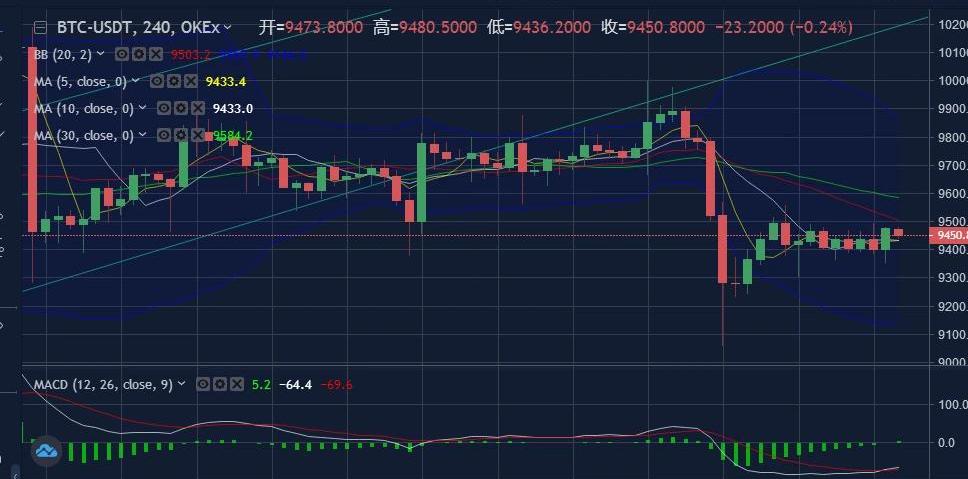 昨日比特币市场情绪萎靡,价格向上突破力度不足,日内价格波动在百余点,高点在止步9487位置,行情以震荡为主。盘面整体波幅较小,早间冲高9480附近受阻后下午回踩9360一带,晚间再次上攻9480受阻而后下行9360反弹,基本维持在9360—9480区间徘徊。