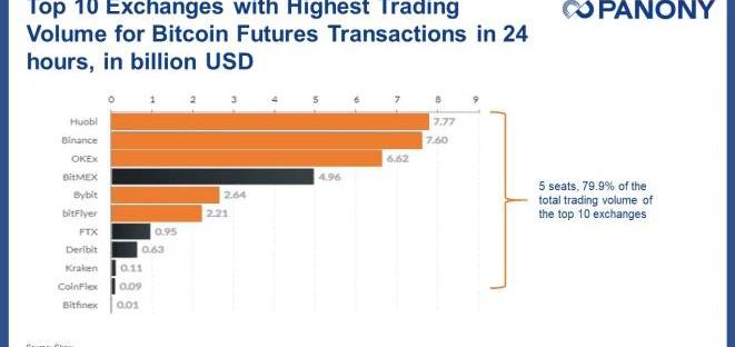 在BTC期货交易量方面,据SKEW统计,火币、币安、OKEx等具备亚洲背景的交易所日均期货交易量占据领导地位。以5月8日数据为例,排名前10的交易所中,来自亚洲交易所占5席,BTC期货交易量占据79.9%。