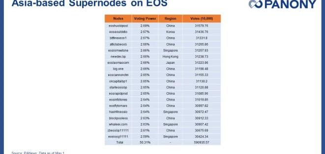 在DPOS共识机制下,大量亚洲节点占据主导地位,以EOS为例,我们统计了截止至2020年5月1日的节点数据,发现排名前21位的超级节点中,有19席的注册地在亚洲,主要分布在中国、新加坡、日本。19席超级节点总计票数高达59亿票,占据全网总票数的50.31%。