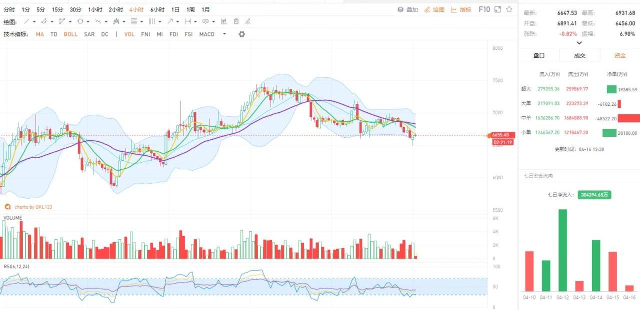 BTC从昨日高点7000美元回落,伴随的下行量能并不明显,四小时RSI临近超卖区间,最低触及6500美元后有所反弹,市场观望情绪不减。短时在6500美元至6800美元区间震荡为主。